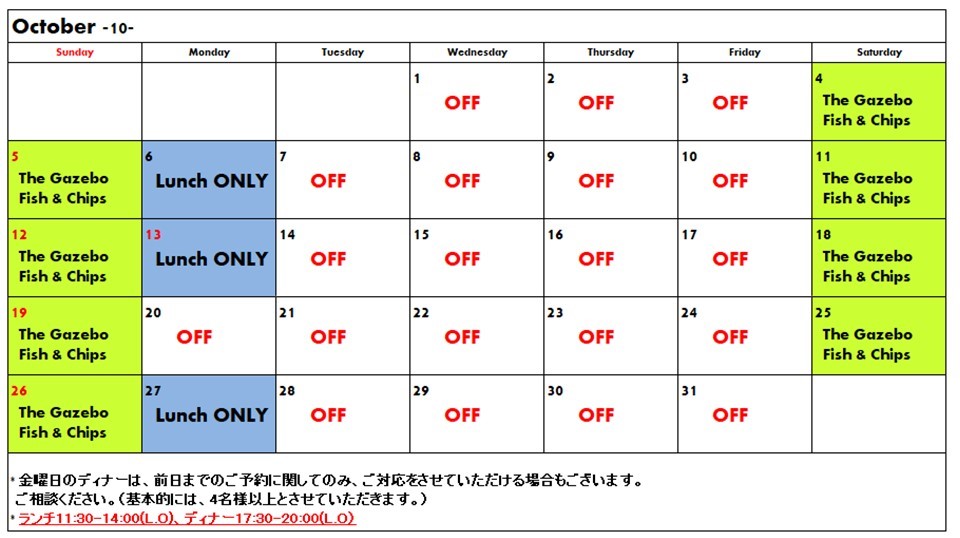 土曜日&日曜日:ランチ+ディナー